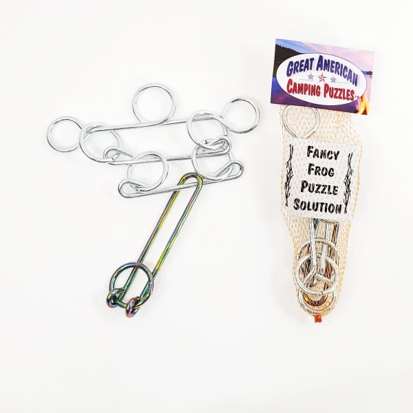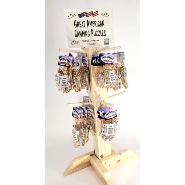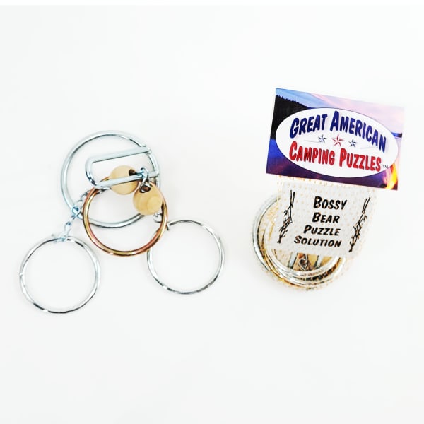 Great American Camping Puzzles. For centuries people have gathered and gazed into campfires thinking about time, their existence and solving problems. Great American Camping Puzzlestm carry on that problem solving tradition when gathered around the fire. Each Camping Puzzle comes plated silver zinc with the solution piece plated gold zinc. This greatly enhances the presentation and understanding of each puzzle. Each Camping Puzzle™ comes individually packaged with puzzle solution inside each package. Great American Camping Puzzles™ come in bundles of 6 per style with 8 different styles from which to choose.