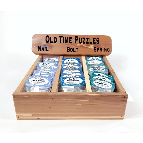 Old Time Pocket Puzzles can display individually in bulk (loose) or can come packaged with the puzzle solution inside. Pay attention to our red cedar display box that displays all 3 styles of the Old Time Pocket Puzzles together.